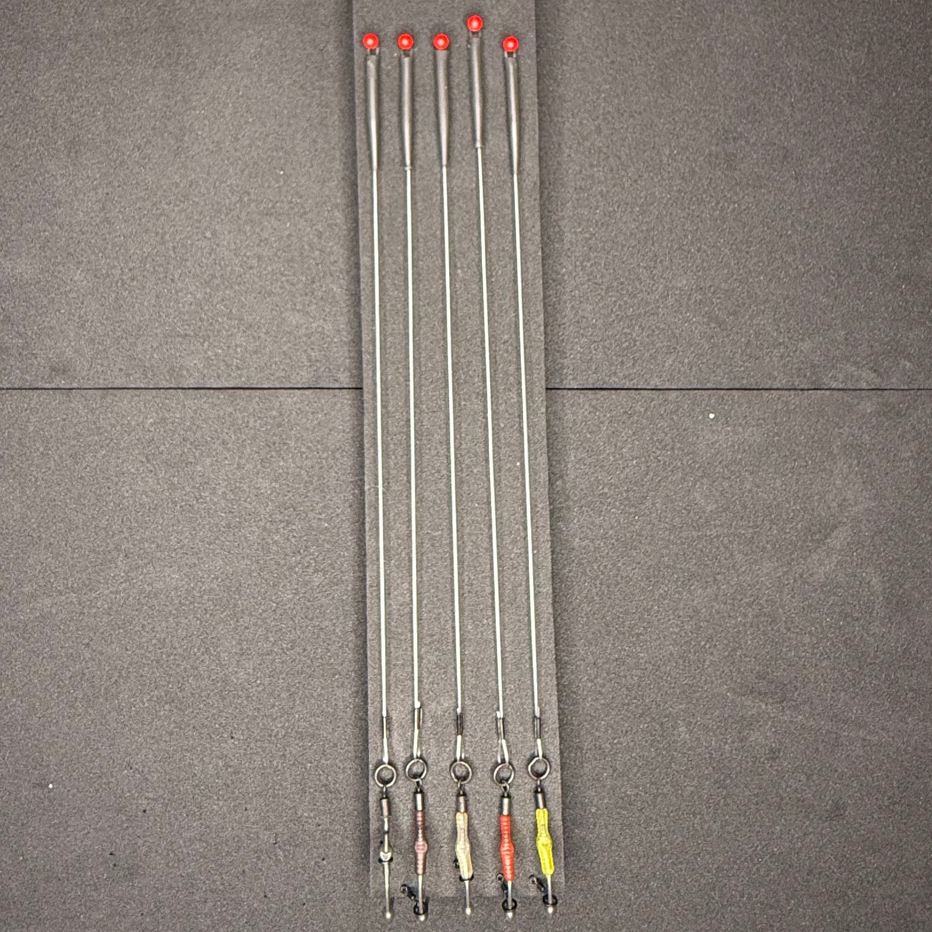 This listing is for 5 OMC Ronnie/Spinner Rigs with OMC Lock Hooks. The stiff boom is tied with OMC 25lb Kickback Stiff Fluorocarbon or OMC 25lb Blend Coated Braid.