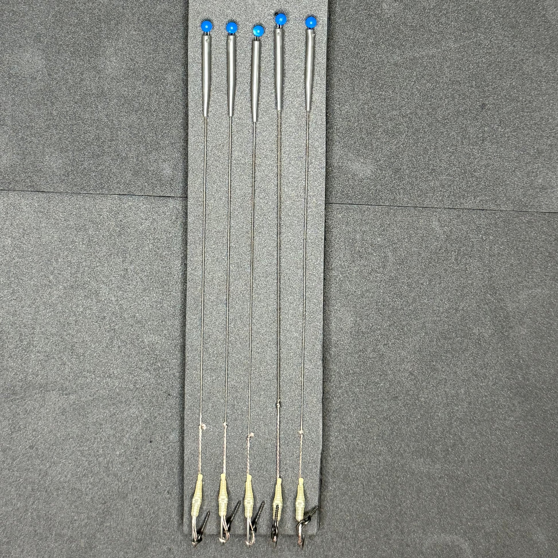 This listing is for 5 OMC Slip D Rigs with OMC Lock Hooks. The rigs are tied with OMC Blend Coated Braid.