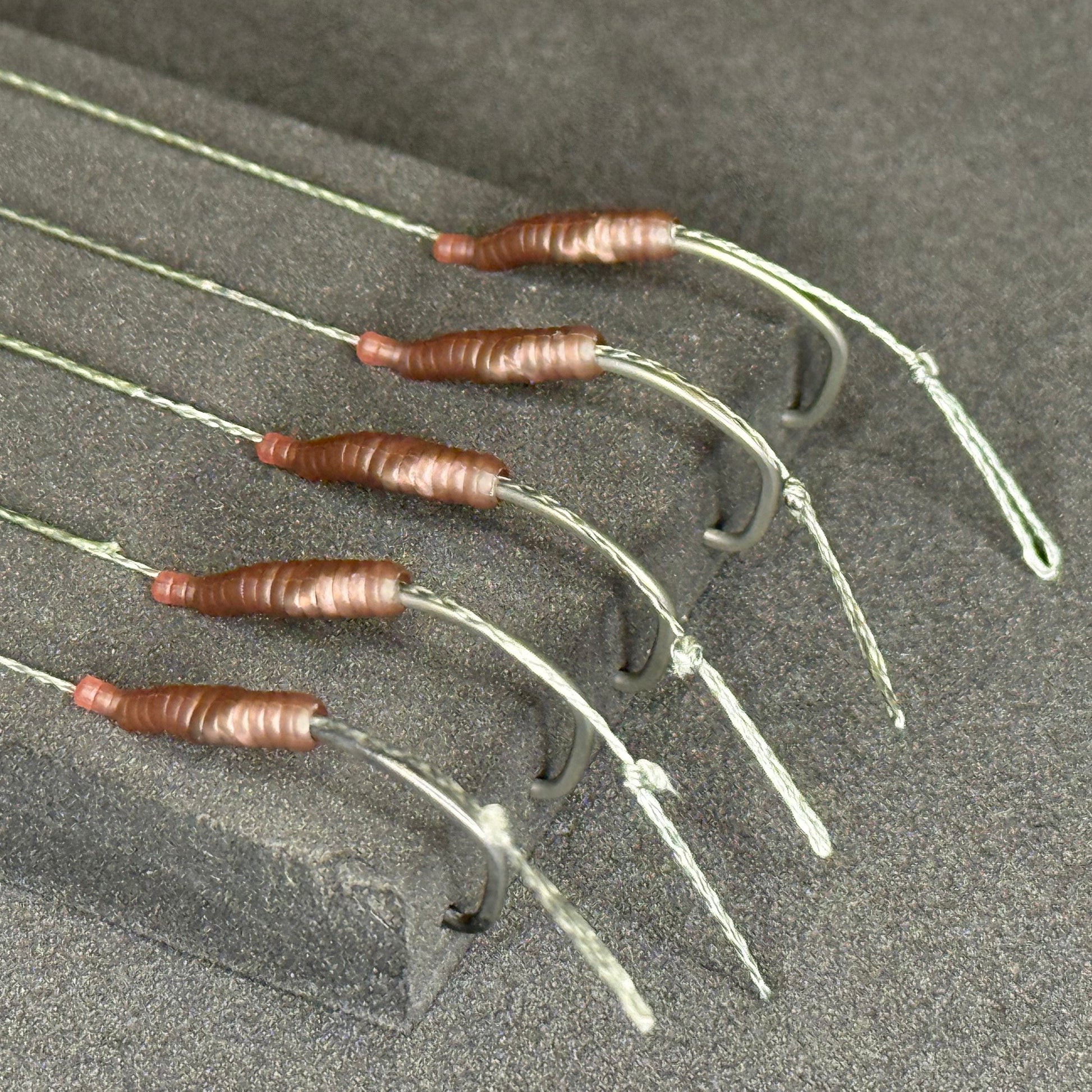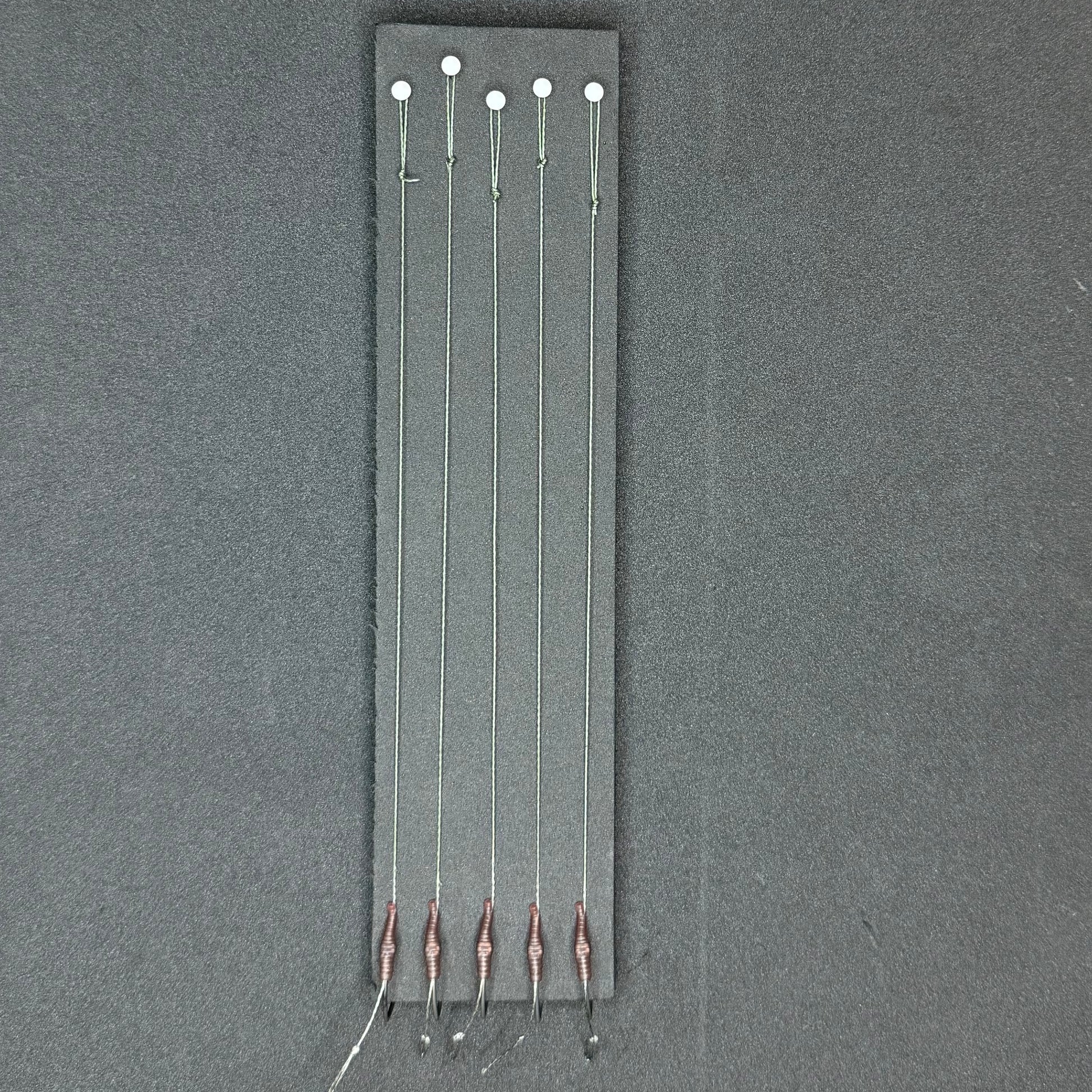 This listing is for 5 OMC Standard Hair Rigs with OMC Lock Hooks. The rigs are tied with OMC Blend Coated Braid.